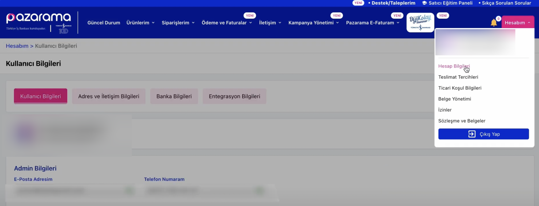 - Pazarama iş ortağım panelinize giriş yaptıktan sonra sağ üstte yer alan Hesabım menüsünden Hesap Bilgisi sayfasına gidin.